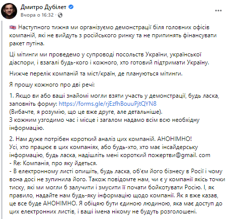 Наступного тижня ми організуємо демонстрації біля головних офісів компаній, які не вийдуть з російського ринку та не припинять фінансувати ракет путіна. Ці мітинги ми проведемо у супроводі посольств України, української діаспори, і взагалі будь-кого і кожного, хто готовий підтримати Україну», — зокрема, написав Дмитро Дубілет.