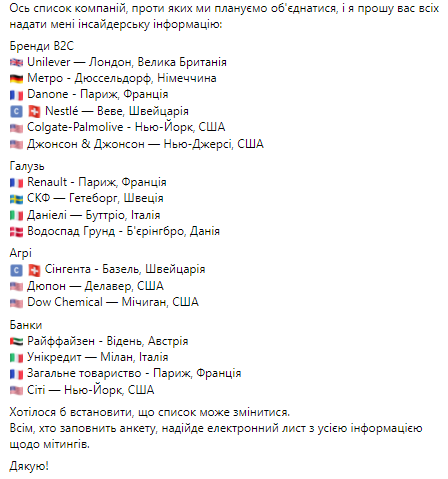 Він також навів перелік комапній та міст/країн, де плануються акції, і оприлюднив два прохання.