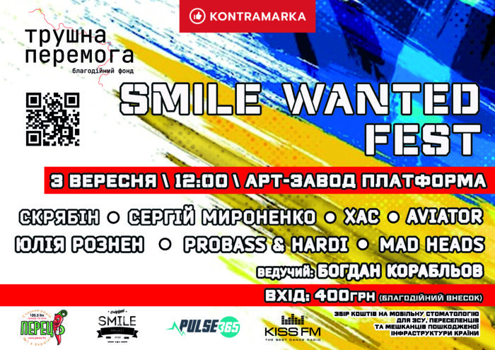 3 вересня благодійний фонд «Трушна Перемога» збере на Арт-Заводі «Платформа» мистецьку спільноту, підприємців та свідомих громадян на фестивалі Smile Wanted. Назва заходу промовиста: на ньому фундація збиратиме кошти на мобільну стоматологію для ЗСУ, переселенців і мешканців областей, що найбільше постраждали від війни.