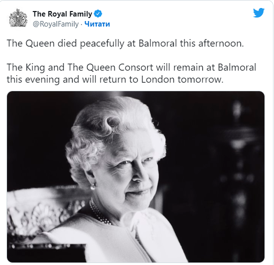 «Королева мирно померла в Балморалі сьогодні вдень. Король і королева-консорт залишаться в Балморалі цього вечора і повернуться до Лондона завтра», — йдеться у повідомленні.