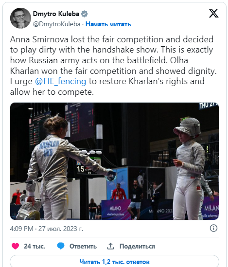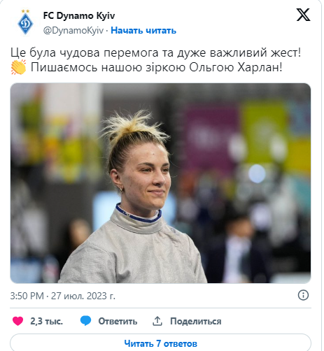 Ольгу Харлан, українську спортсменку з фехтування, отримала підтримку від українського суспільства після того, як її дискваліфікували з Чемпіонату світу з фехтування-2023 в Мілані за те, що вона відмовилася пожимати руку російській суперниці Анні Смирновій.