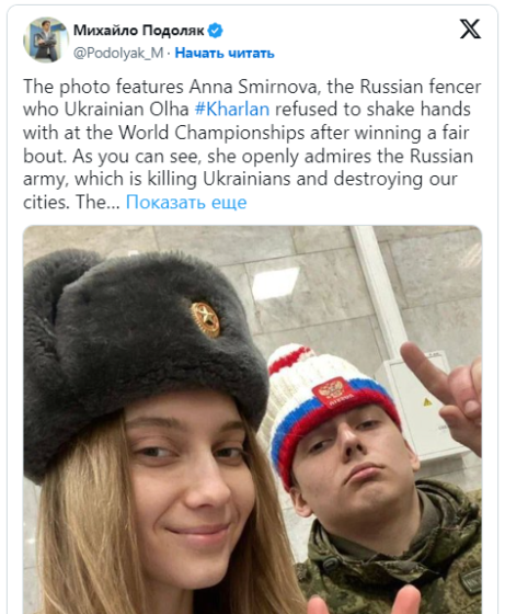 Михайло Подоляк, радник глави Офісу Президента України, опублікував фотографію Анни Смирнової з її братом, де видно, як російська спортсменка «не підтримує війну в Україні» та не використовує символи російської агресії «V».
