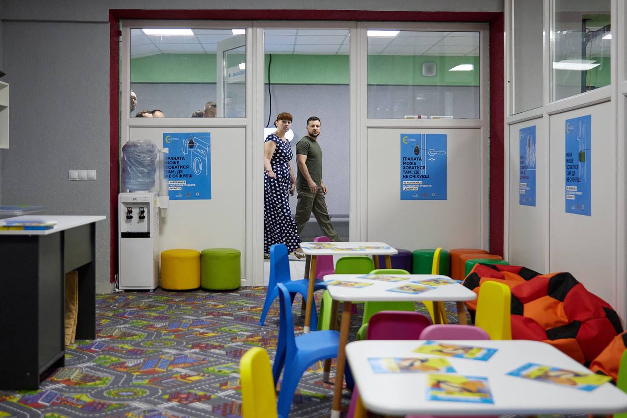 Глава держави привітав першачків та їхніх учителів, а також оглянув підвальне приміщення школи, облаштоване для укриття дітей під час повітряних тривог. Наприкінці зустрічі президент разом з учнями першого класу взяв участь у церемонії погашення благодійних поштових марок «Пес Патрон» — до церемонії приєднався і сам чотирилапий шукач вибухівки.